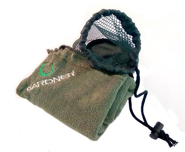 - Black towel with the green Gardner logo embroidered in the corner.