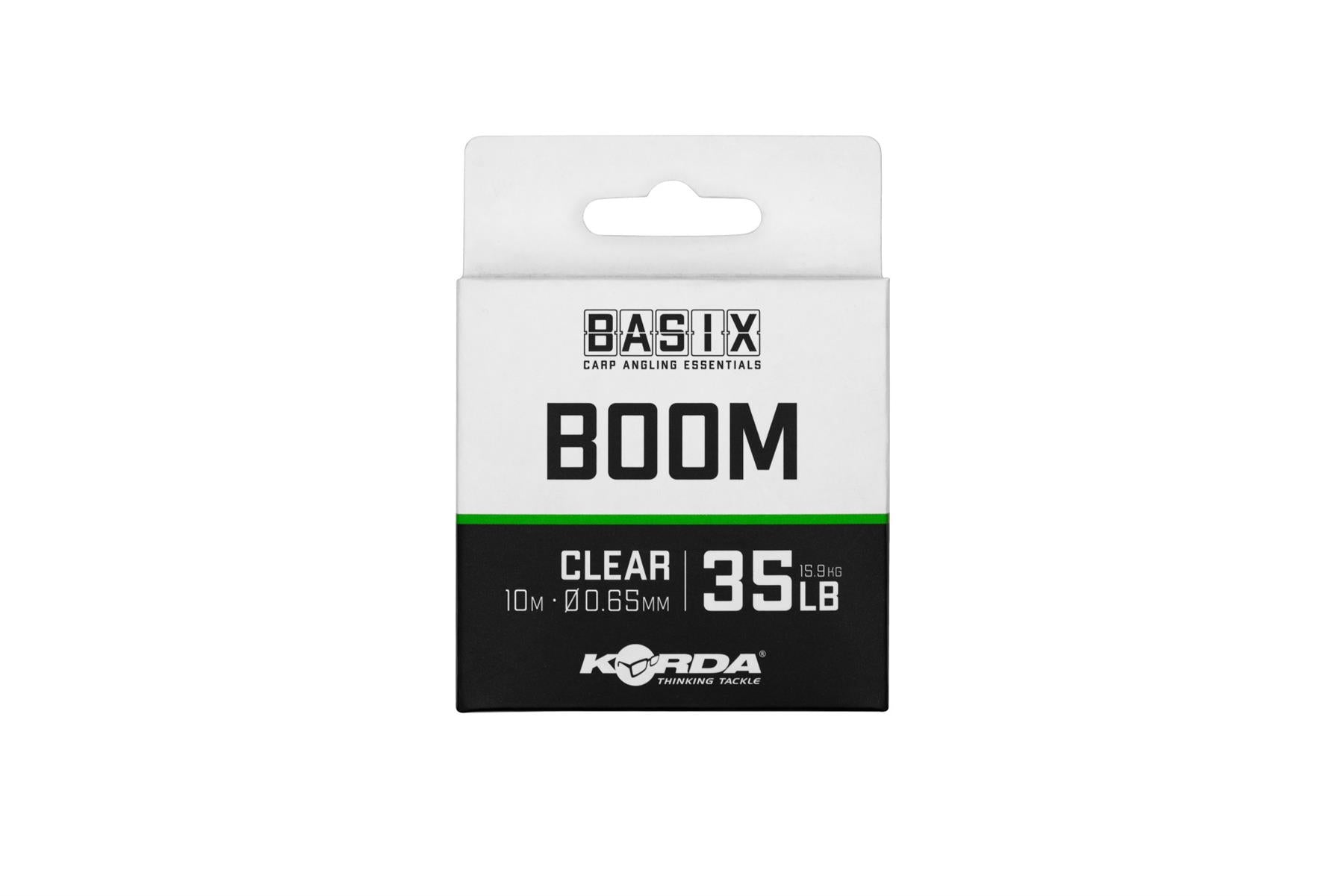 Basix Boom comes in two different breaking strains 25lb 0.55mm (use 0.6 krimp) and 35lb 0.65mm (use 0.7 krimp), with 15m on each spool.