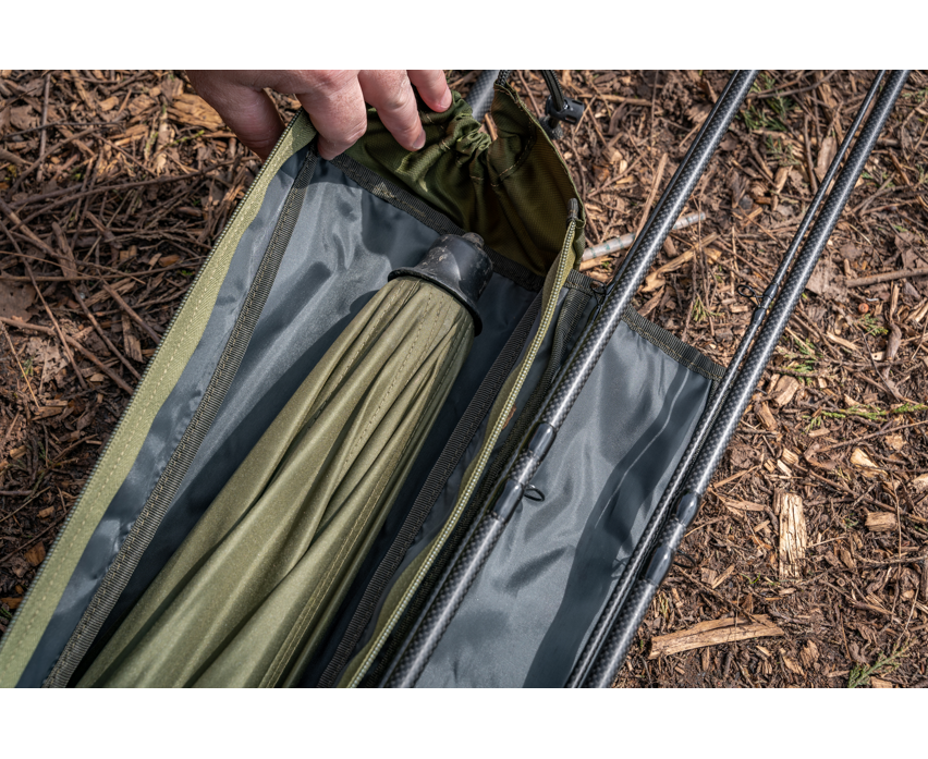 An innovative new way to carry your loaded rods and reels, alongside your shelters, brollies and bankware. The compartment for your rods hinges away from the rear shelter compartment, providing all the benefits of a quiver with added rod protection. Has a padded area designed to house two rods and up to 8000 sized reels, plus a larger rear compartment that fits brollies and nets inside. Also features a simple outer pocket for net handles or banksticks. Complete with removable and adjustable padded shoulder strap for comfortable transportation.