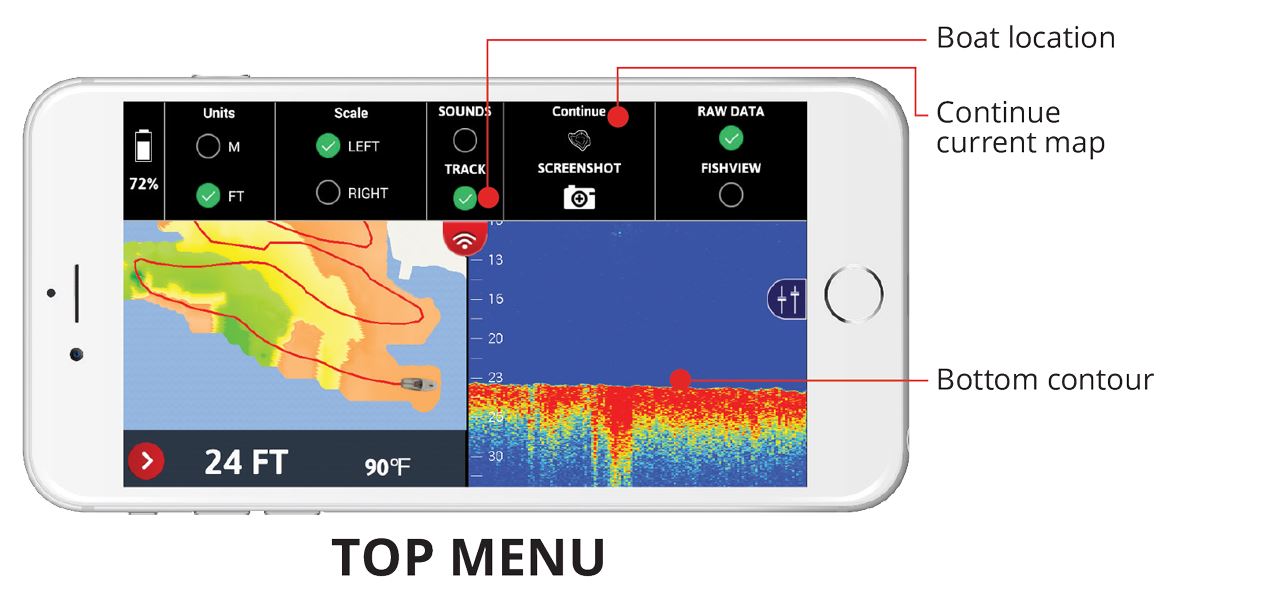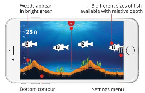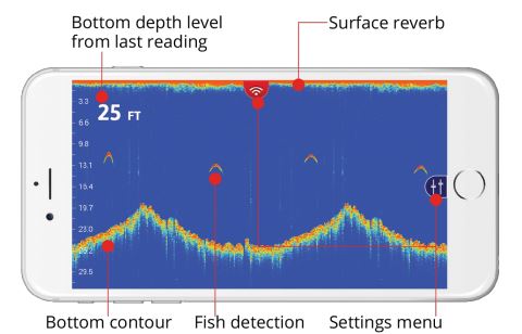 FISH VIEW is our custom view where we take the RAW sonar data and redraw it on the screen in a more simplified manner for quick and easy access. Specifically, we remove the surface reverb and draw a more simplified bottom so that you get a nice clean water column. Whenever the sonar reads a disturbance in the water column, we draw a fish icon (there are 3 sizes) on the screen at the position where we saw that disturbance. This makes it easy for you to see and hear when there are fish under your FishHunter PRO sonar. In addition, you can have your phone make a sonar “ping” whenever fish are found beneath your FishHunter PRO so you don’t have to look at your phone at all.