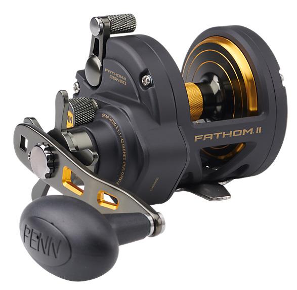 The second generation PENN Fathom II star drag reel is built with a rigid metal frame and sideplates, now with added features to make it more angler friendly than ever. Featuring our fast gear access sideplate, any angler can service their gears and HT-100 drag system quickly and efficiently. The PENN live spindle design offers long, effortless casts, while the power gear ratios (select models only) give ultimate torque for winching up deep fish.