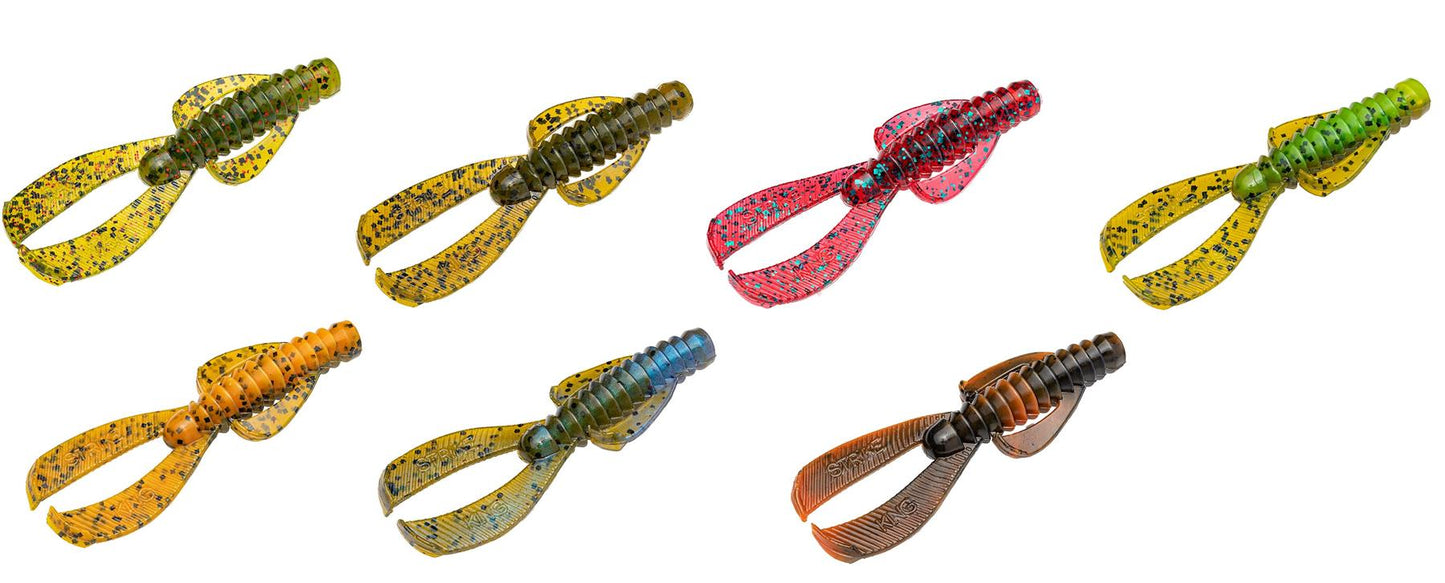 Available in seven colours: Summer Craw, Bama Craw, Blue Craw, Watermelon Red Flake, Green Pumpkin, Crawdaddy and Red bug